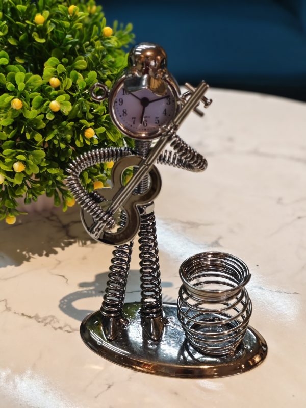 Artistic Metal Guitarist Showpiece with Clock and Spiral Pen Stand – Stylish Desk Organizer and Unique Gift for Music Lovers